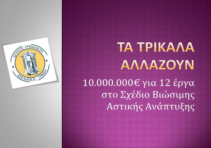 Τα μεγαλύτερα έργα των τελευταίων 20 ετών για τον Δήμο Τρικκαίων υλοποιούνται μέσω των Σχεδίων Βιώσιμης Αστικής Ανάπτυξης. Ο Δήμος Τρικκαίων με 10.000.000 € αλλάζει το πρόσωπο της πόλης των Τρικάλων, δίνει ώθηση στην τοπική αγορά, αναπλάθει τα βασικά της σημεία, αξιοποιεί τον Ληθαίο και τις κεντρικότερες πλατείες.