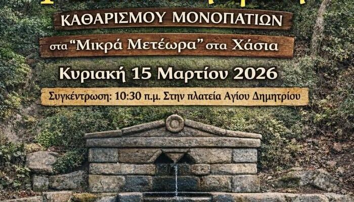 Η δράση θα πραγματοποιηθεί την Κυριακή 15 Μαρτίου 2026, με στόχο την προστασία του φυσικού περιβάλλοντος, την ανάδειξη των τοπικών μονοπατιών και την ενίσχυση της συμμετοχής των πολιτών σε δράσεις εθελοντισμού.