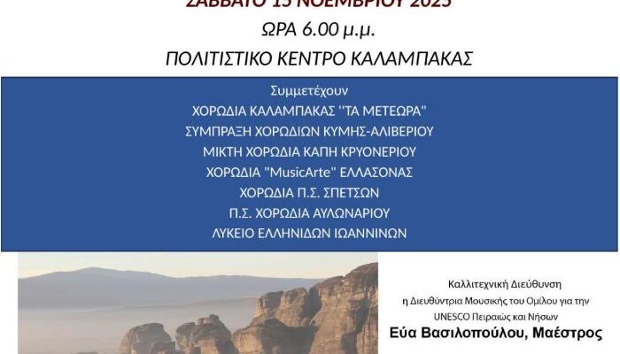 Ο Όμιλος για την UNESCO Πειραιώς & Νήσων και ο διεθνής οργανισμός International Action Art, υπό την αιγίδα του Δήμου Μετεώρων, διοργανώνουν το 2ο Χορωδιακό Φεστιβάλ Δήμου Μετεώρων, το Σάββατο 15 Νοεμβρίου 2025 και ώρα 6:00 μ.μ., στο Πολιτιστικό Κέντρο Καλαμπάκας.
