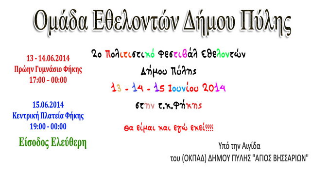 Η Ομάδα Εθελοντών του Δήμου Πύλης σας προσκαλεί στο 2ο Πολιτιστικό Φεστιβάλ Εθελοντών, που θα πραγματοποιηθεί στις 13-14-15 Ιουνίου 2014 στην τ.κ.Φήκης στο πρώην Γυμνάσιο και στην κεντρική Πλατεία υπό την αιγίδα του OKΠΑΔ Δήμου Πύλης “ΑΓΙΟΣ ΒΗΣΣΑΡΙΩΝ”.