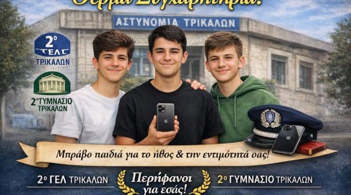 Ο Διευθυντής της Δευτεροβάθμιας Εκπαίδευσης Τρικάλων κ. Αλέξανδρος Γ. Καπανιάρης και το προσωπικό της Διεύθυνσης συγχαίρουμε θερμά τους μαθητές της Α’ Τάξης του 2ου Λυκείου Πολύζο Κωνσταντίνο και Παπαποστόλου Κωνσταντίνο και τον μαθητή της Γ’ τάξης του 2ου Γυμνασίου Αναγνώστου Γεώργιο οι οποίοι βρήκαν και παρέδωσαν στο Αστυνομικό Τμήμα Τρικάλων κινητό τηλέφωνο iphone, δίνοντας παράδειγμα ήθους και εντιμότητας για τους/τις συμμαθητές/τριές τους αλλά και για όλους μας.