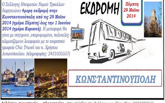 4μερη εκδρομή του Συλλόγου Ηπειρωτών Τρικάλων 29/04/2014 Τοπικά - Θεσσαλικά Δημήτρης Παδιός 4μερη εκδρομή του Συλλόγου Ηπειρωτών Τρικάλων στην Κωνσταντινούπολη . Ειδήσεις σήμερα Σε βαρύ κλίμα θλίψης και οδύνης η κηδεία της Έλενας ΚατσαρούΤην Κυριακή το 40ήμερο μνημόσυνο της ΒΑΣΙΛΙΚΗΣ ΚΟΥΚΙΑΤην Κυριακή το 40ημερο μνημόσυνο ΒΑΪΑΣ ΜΑΡΓΑΡΙΤΗ Δείτε όλες τις τελευταίες Ειδήσεις από την Ελλάδα και τον Κόσμο, τη στιγμή που συμβαίνουν, στο trikalain.gr