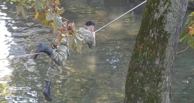 Τα βλέμματα εκατοντάδων περαστικών έστρεψαν πανω τους σήμερα το πρωί σπουδαστές της ΣΜΥ, καθώς μαζί με τους εκπαιδευτές τους έκαναν ασκήσεις επιδεξιότητας σε τεντωμένο σχοινί, πάνω από τα νερά του Ληθαίου.