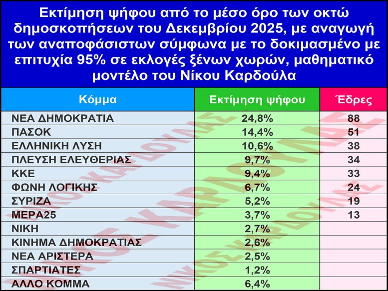 Σε σχέση με την εκτίμηση ψήφου από το μέσο όρο των 11 δημοσκοπήσεων του Νοεμβρίου 2025, όπου η αναγωγή των αναποφάσιστων έγινε με το ίδιο μαθηματικό μοντέλο: