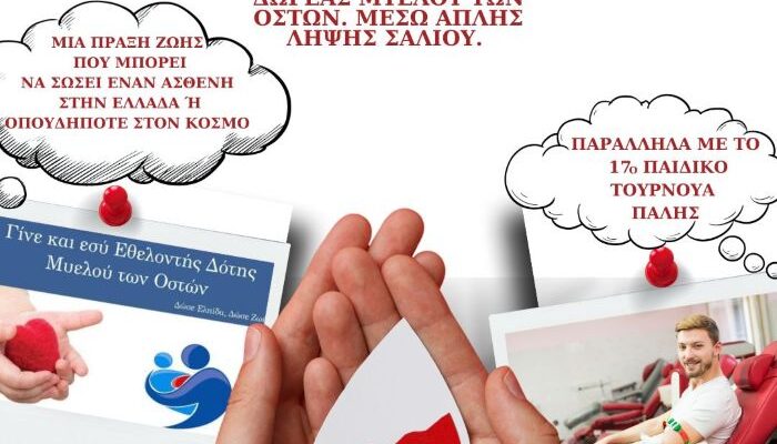 - Την Κυριακή 21/12/2025, ο ΑΠΣ Τρίκαλα, τα ΚΔΑΠ ΜΑΘΗΣΗ, την Μονάδα Πρόληψης του Γενικού Νοσοκομείου Τρικάλων και τον Δήμο Τρικκαίων, συνδιοργανώνουν εκδήλωση με θέμα: «Γίνε ο Ήρωας Κάποιου. Γίνε Εθελοντής Δότης Μυελού των Οστών», στο Κλειστό Γυμναστήριο Τρικάλων (οδός Κατσιμήδου), ώρα έναρξης 10:00-14:00 (στα πλαίσια διεξαγωγής του 17ου Πανελλήνιου Παιδικού Τουρνουά Πάλης).
