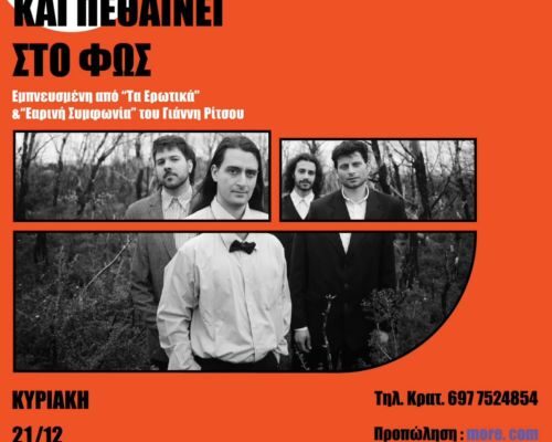 Η θεατρική ομάδα Volya παρουσιάζει την παράσταση «Αυτό που γεννιέται και πεθαίνει στο φως», μια πρωτότυπη σκηνική σύνθεση θραυσμάτων από την Εαρινή Συμφωνία και τα Ερωτικά του Γιάννη Ρίτσου. Η παράσταση αποτελεί μια πρωτότυπη σκηνική σύνθεση θραυσμάτων από την «Εαρινή Συμφωνία» και τα «Ερωτικά» του Γιάννη Ρίτσου, εστιάζοντας στην αναζήτηση του έρωτα, την απώλεια και την ανθρώπινη ανάγκη για σύνδεση. Με οδηγό τη μουσικότητα του λόγου του ποιητή, τέσσερις ηθοποιοί εξερευνούν σκηνικά τη συναισθηματική έκφραση, την ευαισθησία και τα πρότυπα ανδρισμού, φωτίζοντας το πώς αυτά διαμορφώνουν τις ερωτικές και υπαρξιακές μας σχέσεις.