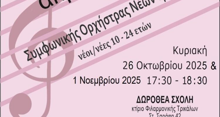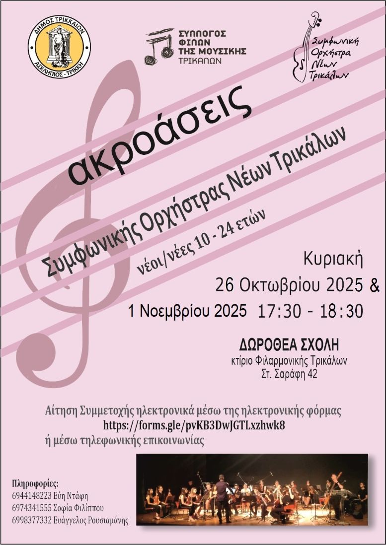 Ο Δήμος Τρικκαίων και ο Σύλλογος Φίλων της Μουσικής Τρικάλων, προσκαλούν νέους και νέες ηλικίας από 10 έως 24 ετών, σπουδαστές – σπουδάστριες μουσικής, μαθητές – μαθήτριες και νεαρούς-νεαρές μουσικούς, να υποβάλλουν αιτήσεις συμμετοχής και να έρθουν στις ακροάσεις για την τη Συμφωνική Ορχήστρα Νέων Τρικάλων (ΣΟΝΤ) για την περίοδο 2025-2026.