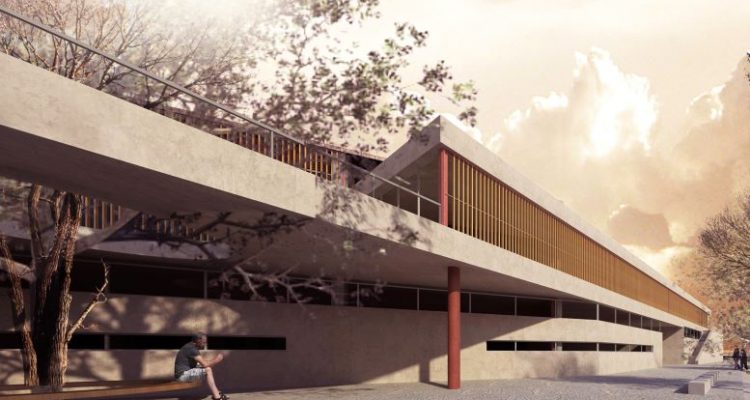 Καθοριστική στη διατύπωση της πρότασης υπήρξε η εκτίμηση του χώρου ανέγερσης ως πυρήνα αναδιοργάνωσης του οικιστικού ιστού, με στόχο την ανάκτηση της δομικής συνοχής του. Η γραμμική ανάπτυξη της νέας κτιριακής μάζας έκκεντρα στο υφιστάμενο δομικό κέλυφος και πάνω στο ίχνος των χαράξεων της παρακείμενης οδικής γέφυρας και της κοίτης του ποταμού, συγκροτεί ένα διαπερατό όριο – διάφραγμα που γίνεται αντιληπτό διφορούμενα ως πύλη ή στοά. Λειτουργεί εντέλει ως «προγεφύρωμα» και αποτελεί ενοποιητικό στοιχείο του υπαίθριου κοινόχρηστου χώρου, – όχι στοιχείο κατάτμησής του. Στο χαλαρό οικιστικό περιβάλλον και χρησιμοποιώντας τέτοια πρωτογενή μέσα η πρόταση επιχειρεί να επιλύσει το θέμα ως μια «ανοιχτή» κομβική περιοχή που παραλαμβάνει τη δυναμική αναδιάταξης του οικισμού, διανοίγεται στη συνολική οπτική αντίληψη του χώρου και οργανώνει τη ρέουσα διάχυση κινήσεων και λειτουργιών.