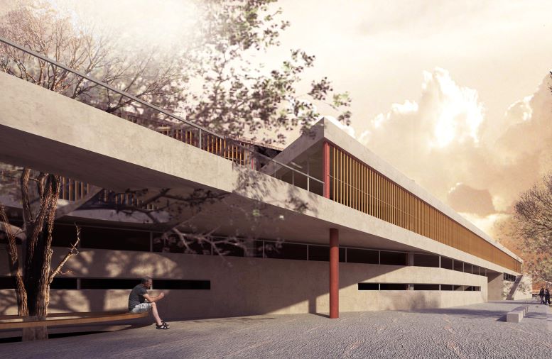 – Ο άξονας της εσωτερικής κίνησης του κτιρίου συνδέει λειτουργικά αλλά και μορφολογικά τις πτέρυγες και παρέχει οπτικές φυγές προς τον ποταμό.