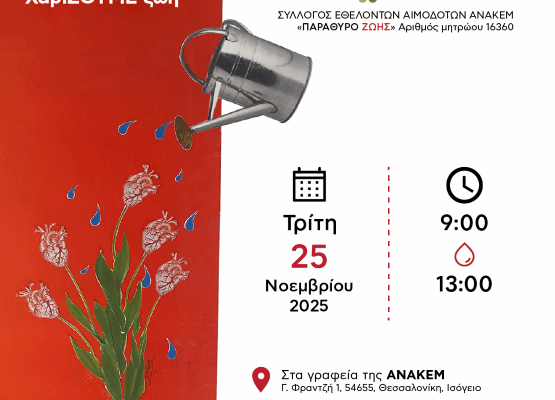 Ο Σύλλογος Εθελοντών Αιμοδοτών της ΑΝΑΚΕΜ “Παράθυρο Ζωής” διοργανώνει, για 4η συνεχή χρονιά, εθελοντική αιμοδοσία την Τρίτη 25 Νοεμβρίου 2025, από τις 9:00 το πρωί έως τη 1:00 το μεσημέρι, στα γραφεία της εταιρείας, Γ. Φραντζή 1, στη Θεσσαλονίκη.