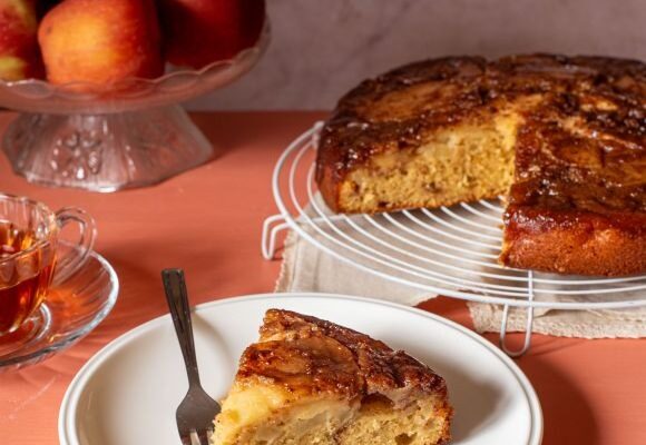 - Αφήνουμε το κέικ 10 λεπτά να σταθεί και στη συνέχεια το αναποδογυρίζουμε σε πιατέλα, όσο είναι ακόμα ζεστό, ώστε τα καραμελωμένα μήλα να αποκαλυφθούν στην κορυφή. Αφήνουμε να κρυώσει τουλάχιστον 15-20 λεπτά πριν το κόψουμε.