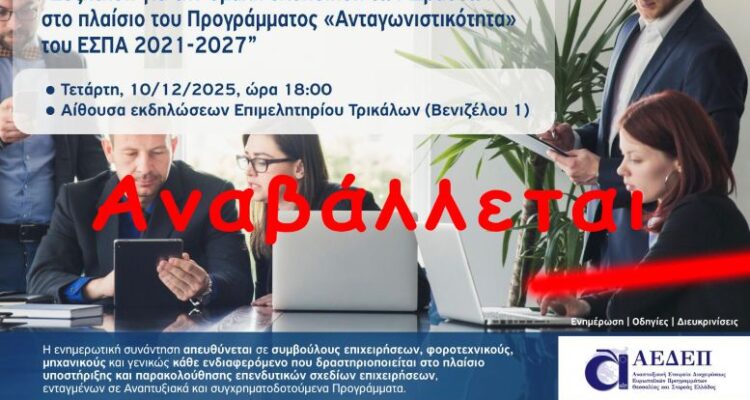 To Επιμελητήριο Τρικάλων, η Ν.Ε. Τρικάλων ΤΕΕ/ΚΔΘ και η Ένωση Οικονομολόγων & Φοροτεχνικών Ελευθέρων Επαγγελματιών Ν. Τρικάλων, ενημερώνουν ότι κρίνεται αναγκαία η αναβολή της προγραμματισμένης για την Τετάρτη, 10/12/2025, ενημερωτικής συνάντησης με θέμα: Συζήτηση για την ομαλή υλοποίηση των Δράσεων στο πλαίσιο του Προγράμματος «Ανταγωνιστικότητα» του ΕΣΠΑ 2021-2027”, λόγω των σημαντικών δυσκολιών μετακίνησης που αντιμετωπίζουν τα στελέχη της ΑΕΔΕΠ Θεσσαλίας και Στερεάς Ελλάδος.