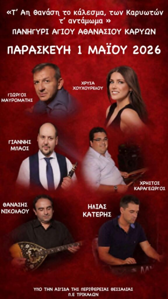 Στις Καρυές οι χτύποι της καμπάνας του Αγίου Αθανασίου ήταν πάντα το σύνθημα για να σμίξουμε. Φέτος την Πρωτομαγιά, σας περιμένουμε να κάνουμε την αυλή του συλλόγου μας, μια μεγάλη γιορτή, τιμώντας τον Προστάτη μας και τις κοινές μας ρίζες. Ελάτε να ανταμώσουμε ξανά με τους ήχους της παράδοσης και τη χαρά της συνάντησης.