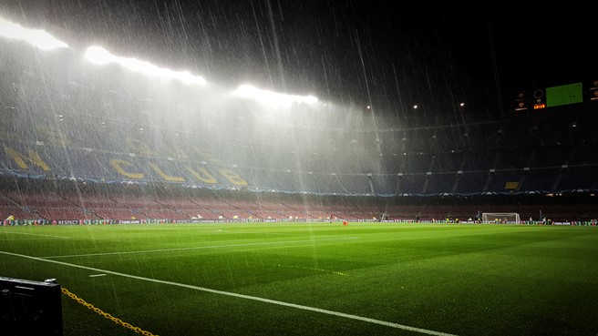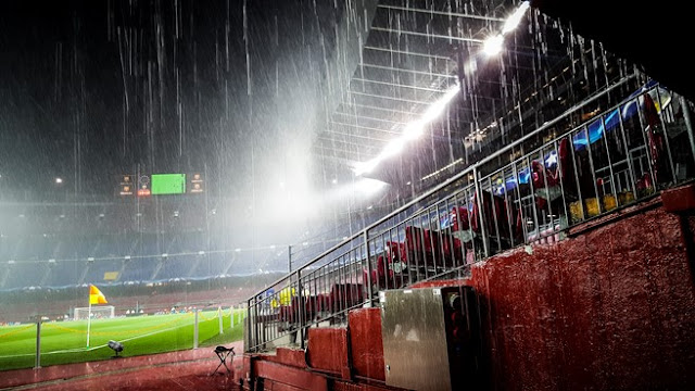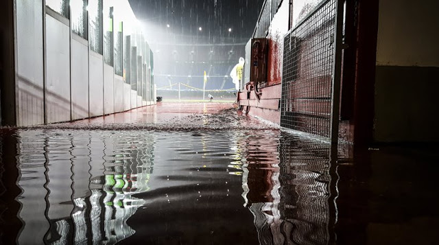 Οι προβλέψεις των μετεωρολόγων δικαιώθηκαν απόλυτα καθώς μία ώρα περίπου πριν από την έναρξη του αγώνα άρχισε να βρέχει σχεδόν ασταμάτητα, πλημμυρίζοντας τους χώρους του γηπέδου, ενώ ο αγωνιστικός χώρος δείχνει να βρίσκεται σε καλή κατάσταση…