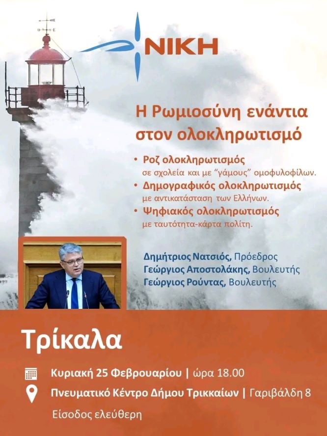 Ανοιχτή Εκδήλωση από το Δημοκρατικό Πατριωτικό Κίνημα ΝΙΚΗ στα Τρίκαλα 21/02/2024 Τοπικά - Θεσσαλικά Δημήτρης Παδιός Ανοιχτή Εκδήλωση από το Δημοκρατικό Πατριωτικό Κίνημα ΝΙΚΗ στα Τρίκαλα Θέμα:Η Ρωμιοσύνη ενάντια στον ολοκληρωτισμό Ομιλητές Δημήτρης Νατσιός,Πρόεδρος Γεώργιος Αποστολάκης,Βουλευτής Επικρατείας Γεώργιος Ρούντας ,Βουλευτής Λάρισας Ειδήσεις σήμερα Ξαναπλημμύρισε ο οικισμός Τρίκκη- Στο ίδιο έργο θεατές! 01.02.2026 Στη Καστανιά του Δήμου Μετεώρων τα μέλη του Ορειβατικού Τμήματος της ΕΥΔΑΠ Αθηνών 01.02.2026 Συνεργασία Ντιντή -Πούλιου για την αντιμετώπιση της κακοκαιρίας 01.02.2026 Δείτε όλες τις τελευταίες Ειδήσεις από την Ελλάδα και τον Κόσμο, τη στιγμή που συμβαίνουν, στο trikalain.gr