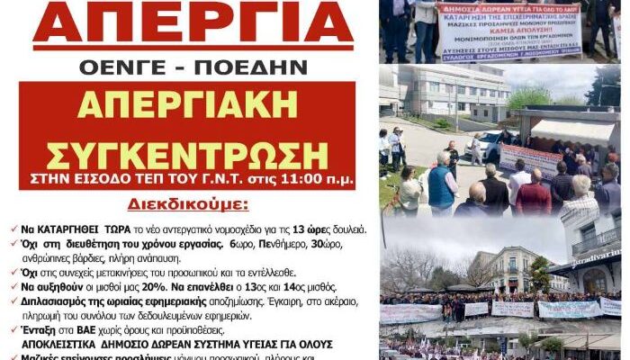 Απεργούν την Πέμπτη 6 Νοεμβρίου οι εργαζόμενοι στην Υγεία 04/11/2025 Απόψεις Δημήτρης Παδιός Στα Τρίκαλα ο Σύλλογος Εργαζομένων Νοσοκομείου καλεί όλους στην πανυγειονομική απεργία 6 Νοεμβρίου και σε συγκέντρωση, στις 11:00 π.μ. στην είσοδο ΤΕΠ του νοσοκομείου Τρικάλων. Ειδήσεις σήμερα Την Κυριακή 9 Νοεμβρίου ο 27ος Λαϊκός Ποδηλατικός «Γύρος των Τρικάλων»Εργαστήρια για το ευρωπαϊκό πρόγραμμα RECIHEPE στα ΤρίκαλαΣυνεχίζονται οι διασταυρωτικοί έλεγχοι οχημάτων – Νέα ειδοποιητήρια για ασφάλιση και τέλη κυκλοφορίας Δείτε όλες τις τελευταίες Ειδήσεις από την Ελλάδα και τον Κόσμο, τη στιγμή που συμβαίνουν, στο trikalain.gr
