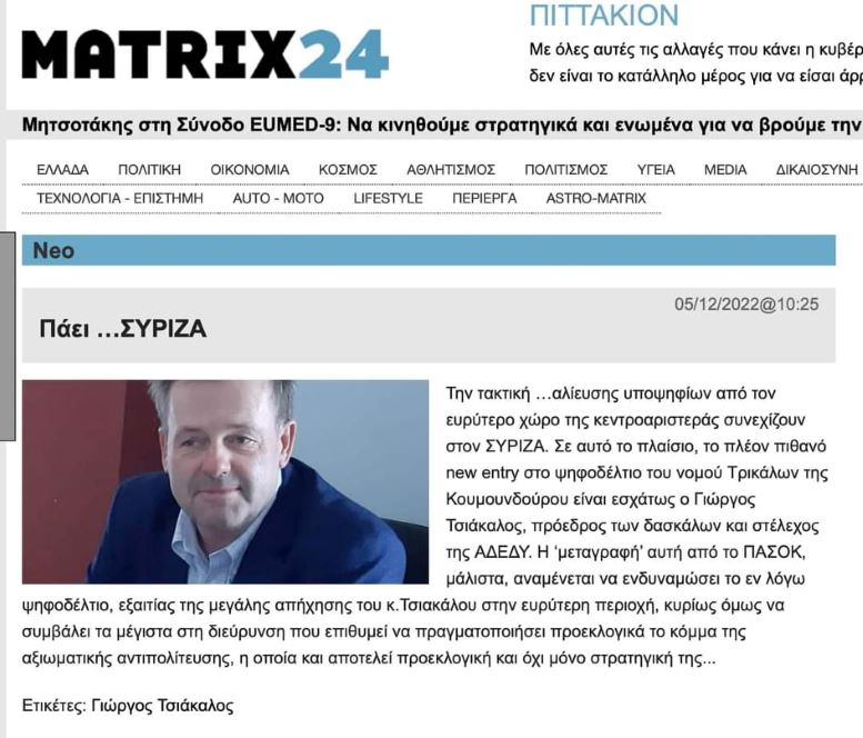 Εκ νέου αναφέρονται τα αθηναϊκά ΜΜΕ στον Γιώργο Τσιάκαλο, εκθειάζοντας τη δυναμική του αλλά και την απήχηση που έχει στην ευρύτερη περιοχή των Τρικάλων. Θεωρείται πως ο εν δυνάμει υποψήφιος Βουλευτής Τρικάλων, συμβολικά είναι από τα πρόσωπα της διεύρυνσης του ΣΥΡΙΖΑ- ΠΣ στην κεντροαριστερά.