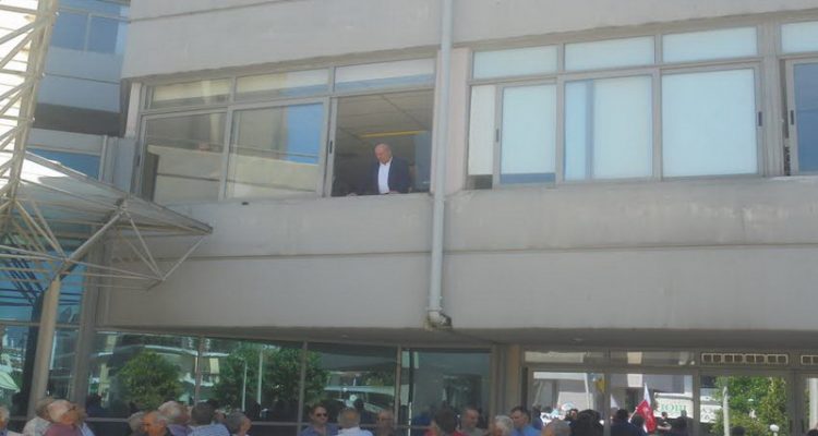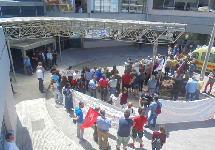 Τουλάχιστον μία ώρα νωρίτερα από την προγραμματισμένη επίσκεψη Πολάκη στο νοσηλευτικό ίδρυμα της πόλης μας, είχαν συγκεντρωθεί στο προαύλιο του νοσοκομείου πάνω από 100 άτομα, μέλη του ΠΑΜΕ, της ΛΑΕ, της ΑΝΤΑΡΣΥΑ και άλλων συλλογικοτήτων, οι οποίοι με πανό και συνθήματα διαμαρτυρίας κατά της κυβέρνησης και των μνημονίων, είχαν δημιουργήσει μια εκρηκτική ατμόσφαιρα.
