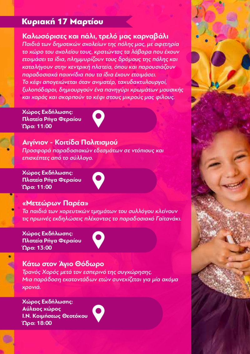 Ανιματέρ, ταχυδακτυλουργοί, ξυλοπόδαροι, δημιουργούν ένα πανηγύρι χρωμάτων μουσικής και χαράς και σκορπούν το κέφι στους μικρούς μας φίλους. Ξεχωριστό, χαρούμενο και γιορτινό τόνο στις εκδηλώσεις δίνουν τα σχολεία της πόλης… Πολιτιστικοί σύλλογοι συμμετέχουν, προσφέρουν τα εδέσματά τους και δίνουν το δικό τους χρώμα στις αποκριάτικες εκδηλώσεις μας.