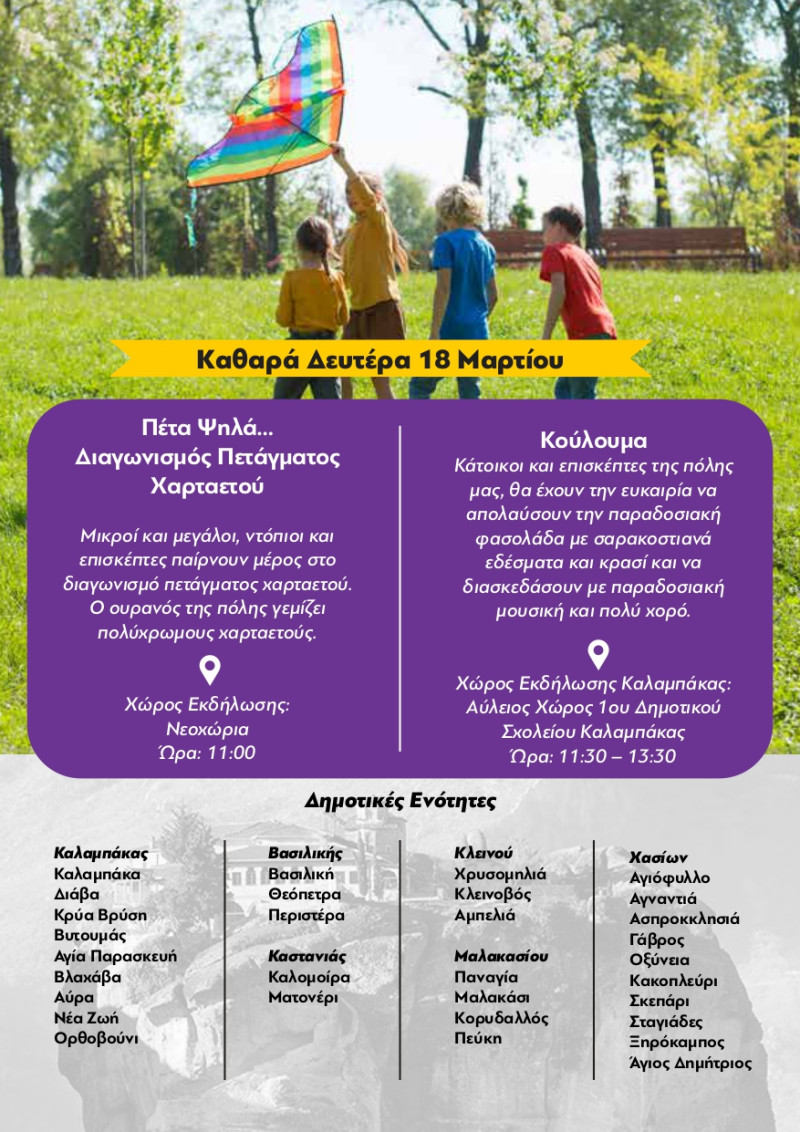Την Καθαρά Δευτέρα μικροί και μεγάλοι, ντόπιοι και επισκέπτες πετάμε τον χαρταετό και γεμίζουμε τον ουρανό της πόλης με χρώματα. Απολαμβάνουμε την παραδοσιακή φασολάδα με σαρακοστιανά εδέσματα στο Κέντρο της Καλαμπάκας και στα περισσότερα χωριά του Δήμου μας.
