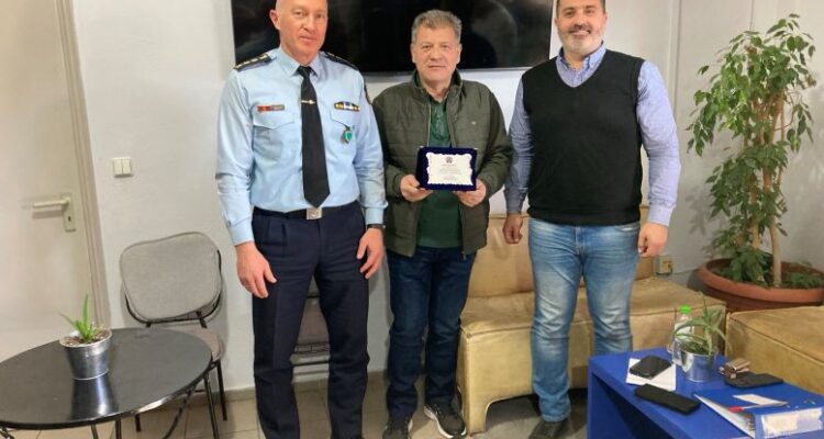 πλακέτα στον Αστυνόμο Α΄ ε.α. κ. Αλέξανδρο ΜΠΑΣΙΟΥΡΗ για την προσφορά του στην Υπηρεσία, οι οποίοι τον ευχαρίστησαν για την άψογη συνεργασία και το ήθος που επέδειξε, την ευγένεια, τη συναδελφικότητα και τον επαγγελματισμό που τον διέκριναν στην υπηρεσιακή του ζωή.