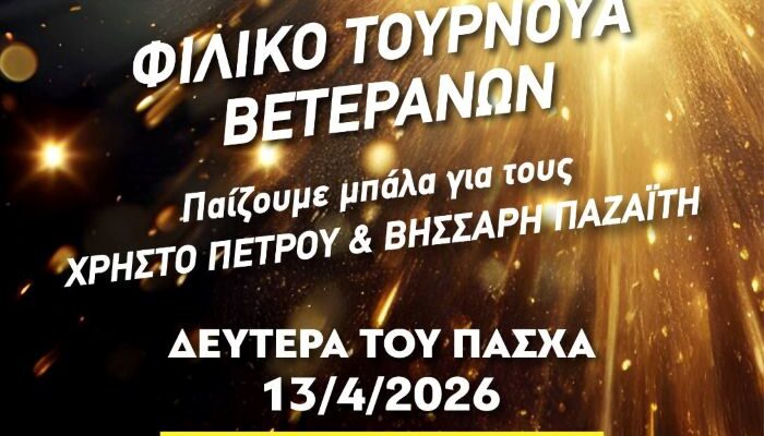 Ο σύλλογός μας, Άρης Αγίας Μονής, διοργανώνει φιλικό τουρνουά βετεράνων, το οποίο θα πραγματοποιηθεί τη Δευτέρα του Πάσχα, 13 Απριλίου και ώρα 17:00, στο γήπεδο Αγίας Μονής.