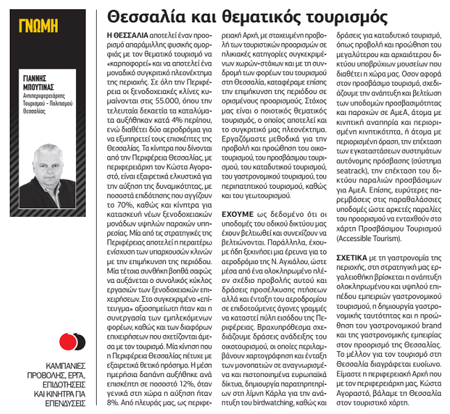 Άρθρο του Γιάννη Μπουτίνα στον «Ελεύθερο Τύπο» για το θεματικό τουρισμό στη Θεσσαλία 16/01/2023 Τοπικά - Θεσσαλικά Δημήτρης Παδιός Στον «Ελεύθερο τύπο» του προηγούμενου Σαββάτου, δημοσιεύθηκε ολοσέλιδο άρθρο του Αντιπεριφερειάρχη Τουρισμού Γιάννη Μπουτίνα, για τον θεματικό τουρισμό στη Θεσσαλία. Ειδήσεις σήμερα Mε πρωτοβουλία του Εργατικού Κέντρου Τρικάλων, νέα σύσκεψη και νέα απεργία 02.02.2026 Ορκωμοσία νέου υπαλλήλου στον Δήμο Πύλης 02.02.2026 Πέντε συλλήψεις για ναρκωτικά στην Καρδίτσα 02.02.2026 Δείτε όλες τις τελευταίες Ειδήσεις από την Ελλάδα και τον Κόσμο, τη στιγμή που συμβαίνουν, στο trikalain.gr