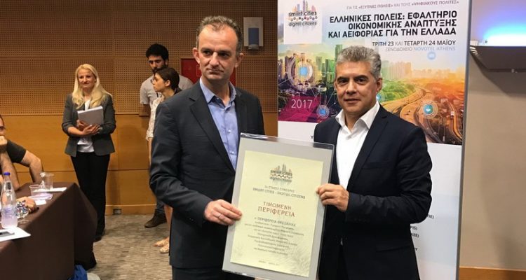 Στο πλαίσιο του συνεδρίου η Περιφέρεια Θεσσαλίας βραβεύτηκε για το σχεδιασμό ολοκληρωμένης ψηφιακής στρατηγικής και την υλοποίηση έργων στους τομείς Ηλεκτρονικής Διακυβέρνησης, Ενεργειακής Κατανάλωσης, Κοινωνικής Συνοχής, Περιβαλλοντικής Διαχείρισης, Πολιτιστικής Κληρονομιάς και Βιώσιμης Αστικής Ανάπτυξης. Το βραβείο παρέλαβε ο κ. Κ. Αγοραστός από τον Γενικό Γραμματέα του Υπουργείου Διοικητικής Ανασυγκρότησης κ. Γρηγόρη Θεοδωράκη.