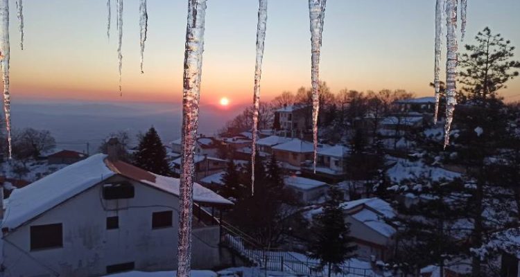 Η χιονόπτωση σε συνδυασμό με τις πολύ χαμηλές θερμοκρασίες που επικρατούν στην περιοχή, έχουν δημιουργήσει ένα άκρως χειμωνιάτικο σκηνικό με τα κρύσταλλα κρέμονται κάτι από τις στέγες των σπιτιών.