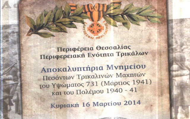 Οι εκδηλώσεις θα κορυφωθούν με τα αποκαλυπτήρια του Μνημείου Πεσόντων Τρικαλινών Μαχητών του Υψώματος 731 και του πολέμου 1940 – 41, το οποίο βρίσκεται στο 6ο χλμ Ε.Ο Τρικάλων – Καρδίτσας.