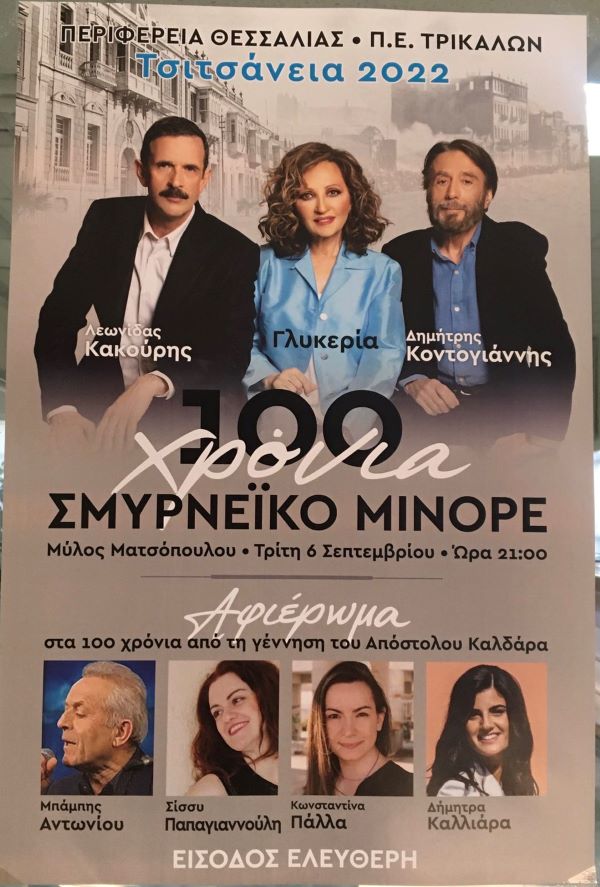 Μία μοναδική βραδιά που διοργανώνεται από την Περιφέρεια Θεσσαλίας και την Περιφερειακή Ενότητα Τρικάλων, αφιερωμένη στα 100 χρόνια από τη μικρασιατική καταστροφή, μέσα από τον καθιερωμένο θεσμό των «Τσιτσανείων». Με την ερμηνεία της Γλυκερίας και του Δημήτρη Κοντογιάννη, αλλά και την αφήγηση του ηθοποιού Λεωνίδα Κακούρη, να βάζουν την δική τους σφραγίδα στο αφιέρωμα.