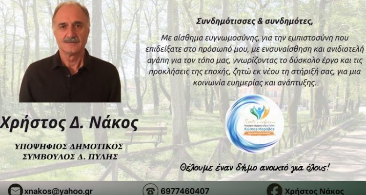 Με ένα μικρό αλλά καλαίσθητο φυλλάδιο, ο Χρήστος Νάκος, πρώην πρόεδρος και νυν δημοτικός σύμβουλος του Δ. Πύλης με τον συνδυασμό “Πρώτα ο Ανθρωπος”, διεκδικεί ξανά την είσοδό του στο νέο Δ.Σ. Πύλης.