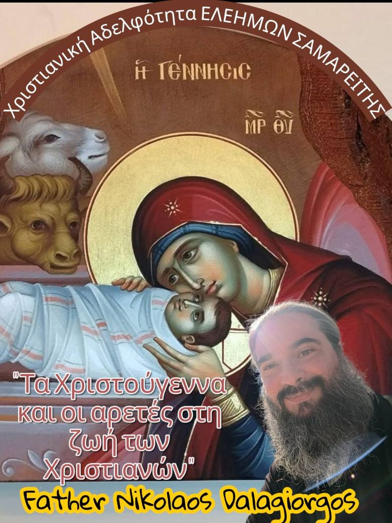 Την Τρίτη 16 Δεκεμβρίου στις 6.00 μ.μ. θα πραγματοποιηθεί η Χριστουγεννιάτικη τελευταία Ομιλία στην αίθουσα της Χριστιανικής Αδελφότητας ΕΛΕΗΜΩΝ ΣΑΜΑΡΕΙΤΗΣ (Στουρνάρα 11) με θέμα: “Τα Χριστούγεννα και οι αρετές στη ζωή των Χριστιανών” από τον πατέρα Νικόλαο Δαλαγιώργο.