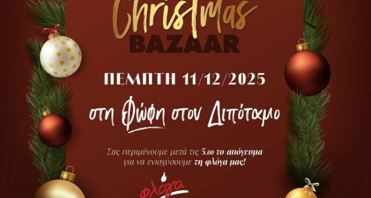 Την Πέμπτη 11 Δεκεμβρίου 2025, η «Φλόγα» διοργανώνει ένα όμορφο Christmas Bazaar στο καφέ «Φώφη» στον Διπόταμο. Από τις 5:00 το απόγευμα, μικροί και μεγάλοι μπορούν να στηρίξουν τα παιδιά με νεοπλασματική ασθένεια μέσα από γιορτινές δημιουργίες και προσφορές αγάπης.