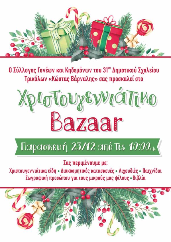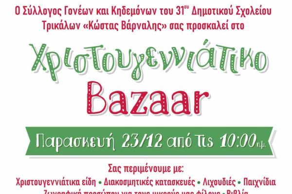 Με τη συμμετοχή των γονέων και κηδεμόνων πρόκειται να πραγματοποιηθεί το Χριστουγεννιάτικο Bazaar στο 31ο Δημοτικό Σχολείο Τρικάλων «Κώστας Βάρναλης» την ερχόμενη Παρασκευή 23/12 από τις 10 το πρωί στο χώρο του Σχολείου.