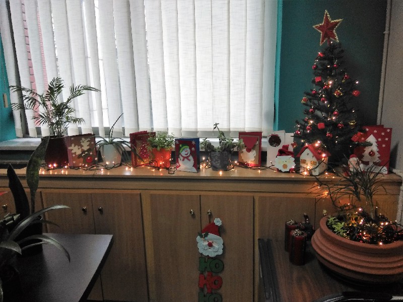 Εκείνο που πρωτοαντικρίζει κανείς και τραβάει αμέσως την προσοχή του, μπαίνοντας στο γραφείο του Αντιδημάρχου Κοινωνικής Μέριμνας Νίκου Σακκά, είναι το πλούσιο Χριστουγεννιάτικο σκηνικό που έχει στηθεί εκεί, με χριστουγεννιάτικο δέντρο, λαμπάκια, αστεράκια, ευχετήριες κάρτες, Άγιους Βασίληδες κλπ.