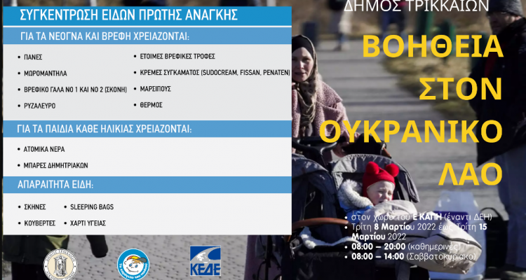 Ξεκίνησε με μεγάλη συμμετοχή η συγκέντρωση ειδών πρώτης ανάγκης για τον ουκρανικό λαό, που συντονίζει ο Δήμος Τρικκαίων, συμμετέχοντας στην πρωτοβουλία συνεργασίας ΚΕΔΕ και «Το Χαμόγελο του Παιδιού», που υλοποιείται σε όλη τη χώρα