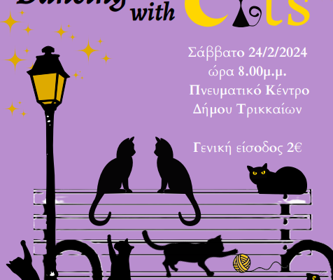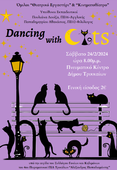 Οι Όμιλοι «Θεατρικό Εργαστήρι» και «Κινηματοθέατρο» του 4ου Πειραματικού ΓΕΛ Τρικάλων «Αλέξανδρος Παπαδιαμάντης» παρουσιάζουν το Σάββατο 24/2/2024 και ώρα 20.00 μ.μ., στην αίθουσα του Πνευματικού Κέντρου Δήμου Τρικκαίων τη μουσικοχορευτική παράσταση“Dancing with Cats”.