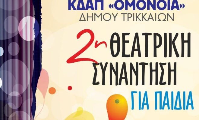 Μια ακόμη πρωτοβουλία για τα παιδιά, από το ΚΔΑΠ ΟΜΟΝΟΙΑ του Δήμου Τρικκαίων που διοργανώνει την 2η Θεατρική Συνάντηση, σήμερα Παρασκευή 5 Απριλίου, στον πίσω αύλειο χώρο του Μουσείου Τσιτσάνη. Τα παιδιά των ΚΔΑΠ του Δήμου και όχι μόνο μας περιμένουν όλους/Ες για μια γιορτή αφιέρωμα στο θέατρο με αφορμή την παγκόσμια ημέρα θεάτρου.