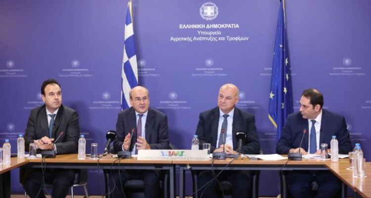 Στην εξειδίκευση των μέτρων στήριξης του αγροτικού κόσμου προχώρησαν σήμερα ο Αντιπρόεδρος της Κυβέρνησης Κωστής Χατζηδάκης, ο Υπουργός Αγροτικής Ανάπτυξης και Τροφίμων Κώστας Τσιάρας, ο Υπουργός Ψηφιακής Διακυβέρνησης Δημήτρης Παπαστεργίου και ο Υφυπουργός Εθνικής Οικονομίας και Οικονομικών Θάνος Πετραλιάς, κατά τη διάρκεια συνέντευξης Τύπου που πραγματοποιήθηκε στα γραφεία του Υπουργείου Αγροτικής Ανάπτυξης και Τροφίμων.