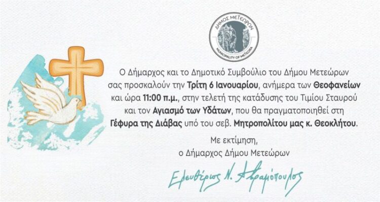 Ο Δήμαρχος και το Δημοτικό Συμβούλιο του Δήμου Μετεώρων σας προσκαλούν την Τρίτη 6 Ιανουαρίου, ανήμερα των Θεοφανείων και ώρα 11:00 π.μ., στην τελετή της κατάδυσης του Τιμίου Σταυρού και τον Αγιασμό των Υδάτων, που θα πραγματοποιηθεί στη Γέφυρα της Διάβας υπό του σεβ. Μητροπολίτου μας κ. Θεοκλήτου.
