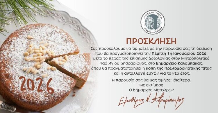 Δήμος Μετεώρων: Πρόσκληση για τη Δεξίωση της Πρωτοχρονιάς 31/12/2025 Τοπικά - Θεσσαλικά Δημήτρης Παδιός Πρόσκληση για τη Δεξίωση της Πρωτοχρονιάς Ειδήσεις σήμερα Μήνυμα Δημάρχου Πύλης για το Νέο Έτος 2026Τέλη κυκλοφορίας 2026: Εκπνέει η προθεσμία – Ποιες φορολογικές υποχρεώσεις πρέπει να πληρωθούν σήμεραΔιάλογος ή αναμέτρηση; Δείτε όλες τις τελευταίες Ειδήσεις από την Ελλάδα και τον Κόσμο, τη στιγμή που συμβαίνουν, στο trikalain.gr