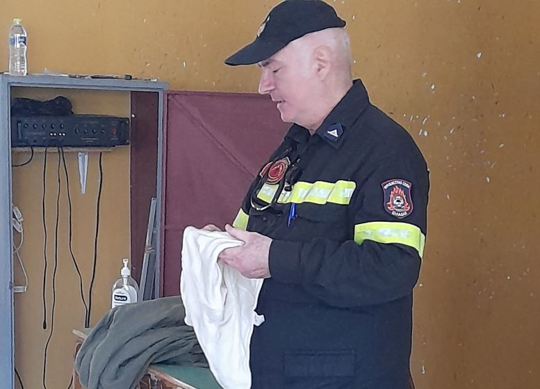 Ακολούθως προχώρησαν σε επίδειξη, παρουσιάζοντας τον απαραίτητο εξοπλισμό του Πυροσβέστη, ενώ εν μέσω ενθουσιασμού οι μαθητές έκαναν χρήση της μάνικας ρίχνοντας νερό ελεγχόμενα.