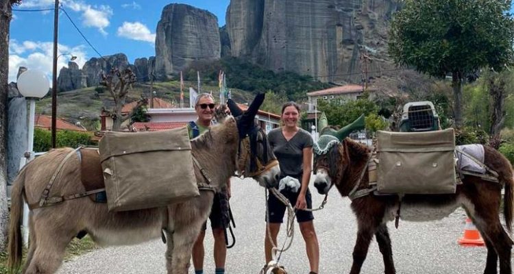 Μια ασυνήθιστη εικόνα με δυο τουρίστες που γυρνούν τον κόσμο με τα γαϊδουράκια τους είχαμε την ευκαιρία να δούμε και στα Μετέωρα.