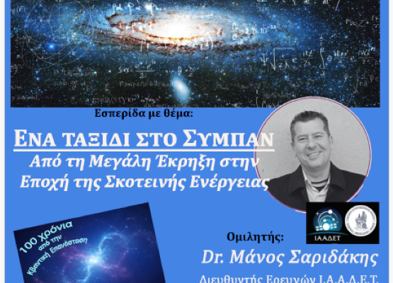 Ομιλητής θα είναι ο Dr. Μάνος Σαριδάκης, Διευθυντής Ερευνών στο Ινστιτούτο Αστρονομίας, Αστροφυσικής, Διαστημικών Εφαρμογών και Τηλεπισκόπησης (Ι.Α.Α.Δ.Ε.Τ.) του Εθνικού Αστεροσκοπείου Αθηνών. Στην ομιλία του θα παρουσιάσει, με τρόπο κατανοητό και προσιτό στο ευρύ κοινό, τη συναρπαστική πορεία του Σύμπαντος από τη Μεγάλη Έκρηξη έως τα σύγχρονα κοσμολογικά ερωτήματα που σχετίζονται με τη Σκοτεινή Ενέργεια, αναδεικνύοντας βασικές έννοιες και προκλήσεις της σύγχρονης κοσμολογίας.