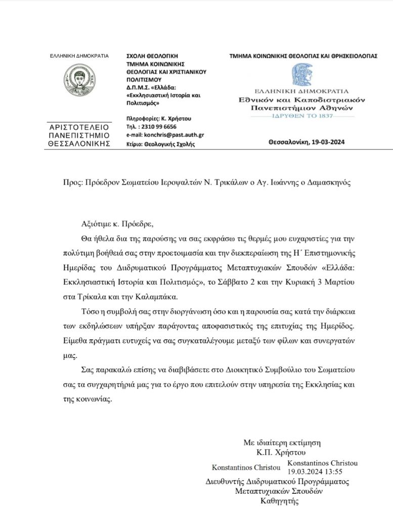 Μια ακόμα αναγνώριση για το Σωματείο Ιεροψαλτών Ν. Τρικάλων “Ιωάννης ο Δαμασκηνός” ήρθε αυτή τη φορά από το Α.Π.Θ. και συγκεκριμένα από το Διϊδρυματικό Πρόγραμμα Μεταπτυχιακών Σπουδών “Ελλάδα: Εκκλησιαστική Ιστορία και Πολιτισμός” για την διεξαγωγή της επιστημονικής διημερίδας που πραγματοποιήθηκε στα Τρίκαλα και την Καλαμπάκα στις 2 και 3 Μαρτίου 2024 σε συνεργασία με τους Δήμους Τρικκαίων και Μετεώρων.