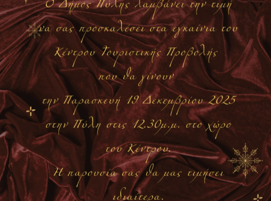Ο Δήμος Πύλης ανακοινώνει τα εγκαίνια του νέου Κέντρου Τουριστικής Προβολής, το οποίο δημιουργήθηκε με στόχο την ενίσχυση και ανάδειξη των τουριστικών δυνατοτήτων της περιοχής.