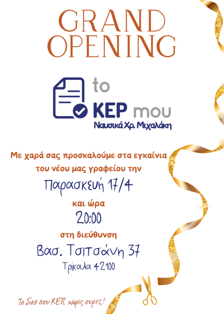 Με μεγάλη χαρά σας προσκαλούμε στα εγκαίνια του νέου μας γραφείου «ΚΕΠ μου – Ναυσικά Χρ. Μιχαλάκη», που θα πραγματοποιηθούν την Παρασκευή 17 Απριλίου και ώρα 20:00, στη διεύθυνση Βασ. Τσιτσάνη 37, στα Τρίκαλα.