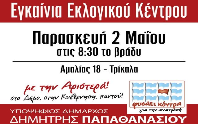 Εγκαίνια εκλογικού κέντρου του Δημήτρη Παπαθανασίου 01/05/2014 Τοπικά - Θεσσαλικά Δημήτρης Παδιός Εγκαίνια εκογικού κέντρου του Δμήτρη Παπαθανασίου την Παρασκευή 2 Μαίου και ώρα 8.30 μ.μ στην οδό Αμαλίας 18 στα Τρίκαλα. Ειδήσεις σήμερα Σε βαρύ κλίμα θλίψης και οδύνης η κηδεία της Έλενας ΚατσαρούΤην Κυριακή το 40ήμερο μνημόσυνο της ΒΑΣΙΛΙΚΗΣ ΚΟΥΚΙΑΤην Κυριακή το 40ημερο μνημόσυνο ΒΑΪΑΣ ΜΑΡΓΑΡΙΤΗ Δείτε όλες τις τελευταίες Ειδήσεις από την Ελλάδα και τον Κόσμο, τη στιγμή που συμβαίνουν, στο trikalain.gr