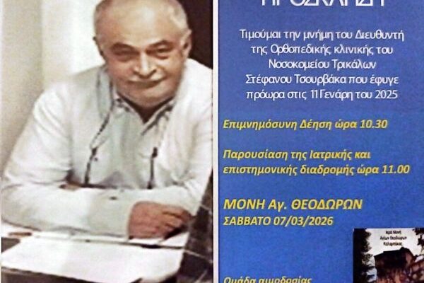 Με αισθήματα τιμής και σεβασμού, σας προσκαλούμε να τιμήσουμε μαζί τη μνήμη του εκλιπόντος Στεφάνου Τσουρβάκα, Διευθυντή της Ορθοπεδικής Κλινικής του Νοσοκομείου Τρικάλων, ο οποίος έφυγε πρόωρα από κοντά μας.